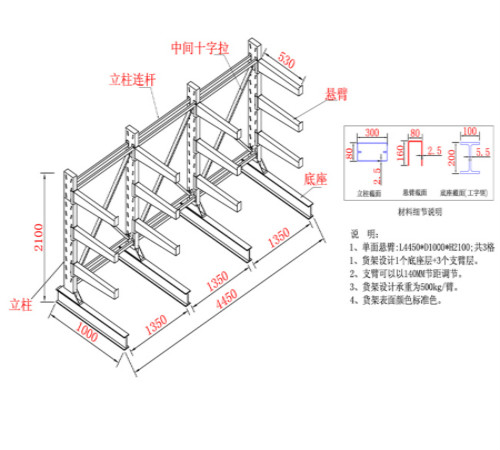 懸臂式貨架是貨架中重要的一種,根據(jù)結(jié)構(gòu)形式可分為單面懸臂式貨架和雙面懸臂式貨架。懸臂式貨架適用于存放長物料、環(huán)型物料、板材、管材及不規(guī)則貨物。懸臂式貨架具有結(jié)構(gòu)穩(wěn)定,載重能力好、空間利用率高等特點。懸臂式貨架立柱多采用H型鋼或冷軋型鋼,懸臂采用方管、冷軋型鋼或H型鋼,懸臂與立柱間采用插接式或螺栓連接式,底座與立柱間采用螺栓連接式,底座采用冷軋型鋼或H型鋼。貨物存取由叉車、行車或人工進行。